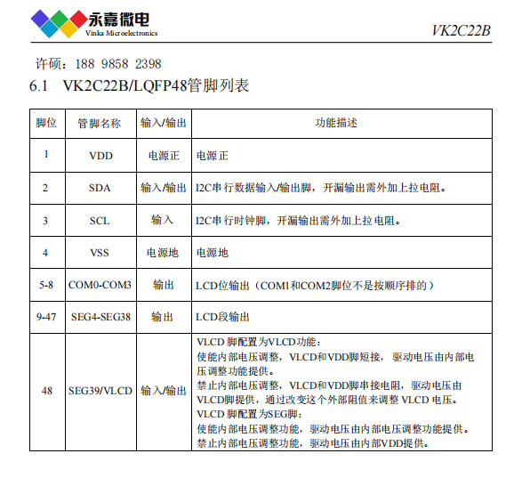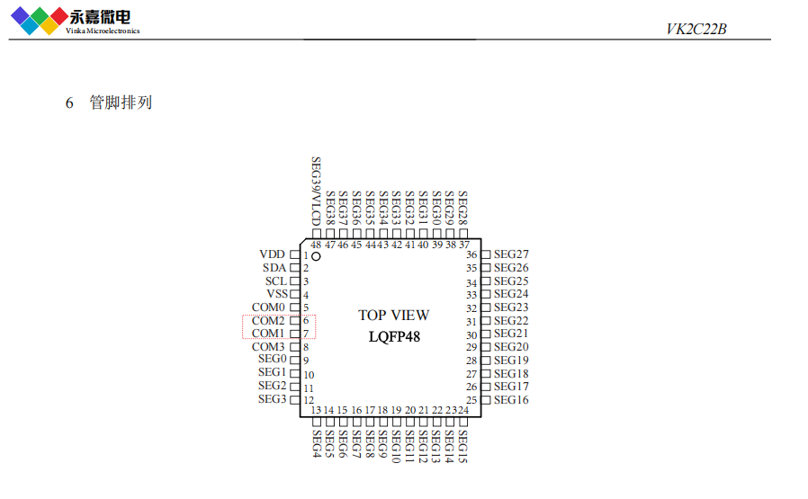 VK2C22B??2.4~5.5V??40seg*4com? ?? 偏置電壓1/2 1/3 ?I2C通訊接口? LQFP48;DICE/DIE裸片(綁定COB);COG(綁定玻璃) 高抗干擾/抗噪/低功耗